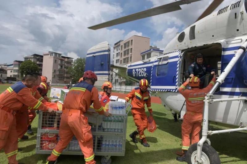 6月19日,拯救东说念主员将救灾物质搬上直升机,准备运往受灾严重的广东省梅州市平远县泗水镇大新村。新华社记者卢汉欣 摄