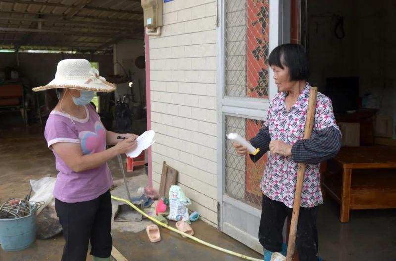6月19日,在受灾严重的广东省梅州市平远县泗水镇大新村,责任主说念主员向村民披发烛炬。新华社记者卢汉欣 摄