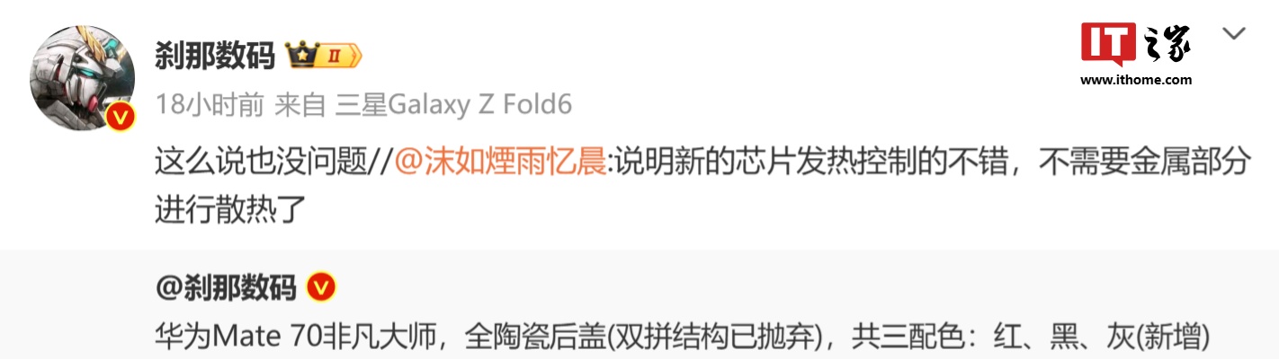▲ IT之家图赏华为 Mate60 Pro+ 宣白博主此前爆料称华为 Mate 70 超卓大师版手机聘请全陶瓷后盖,已毁灭双拼结构。当天其回应网友筹办“新的芯片发烧截止的可以,不需要金属部分进行散热”的估量,称“这样说也没问题”。