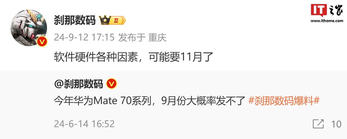 IT之家 9 月 13 日音问,博主 @一瞬数码 昨日线路,由于软件硬件多样身分,华为 Mate 70 手机可能要 11 月发布。